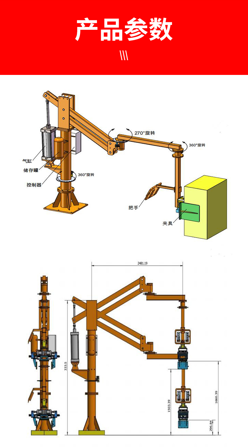 助力機械手描述:助力臂主體配有儲氣罐,可在斷氣情況下繼續使用一個循環,防止工件下降。并設有安全系統,安全上采用雙放措施,非沒有放置到安全位置不能釋放。操作控制方式采用空載平衡和按鍵UP/DOWN。