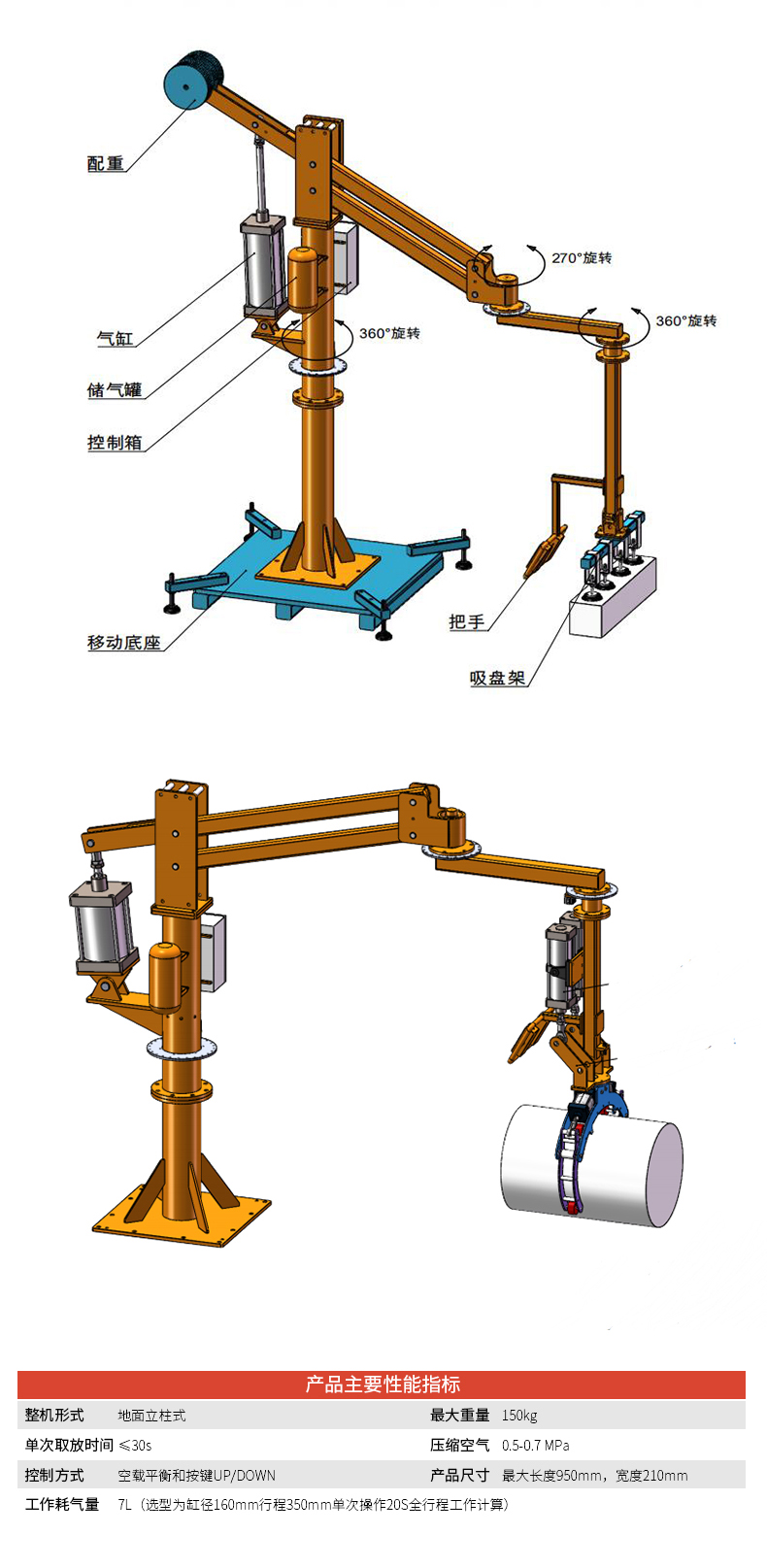 b)人工操作移動助力機械手空載時出于懸浮平衡狀態可以拉動隨行,各旋轉部位為機械結構,拉動隨行,負載后需按鍵控制上下。